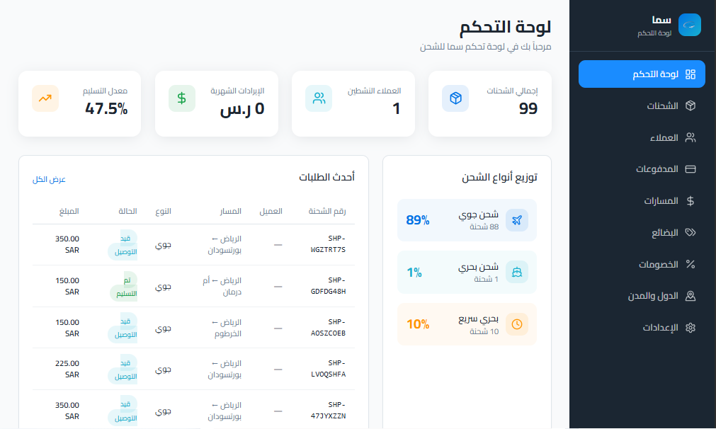 منصة متكاملة لإدارة الشحنات - تتبع الشحنات، حاسبة شحن ذكية، نظام CRM، إدارة المدفوعات