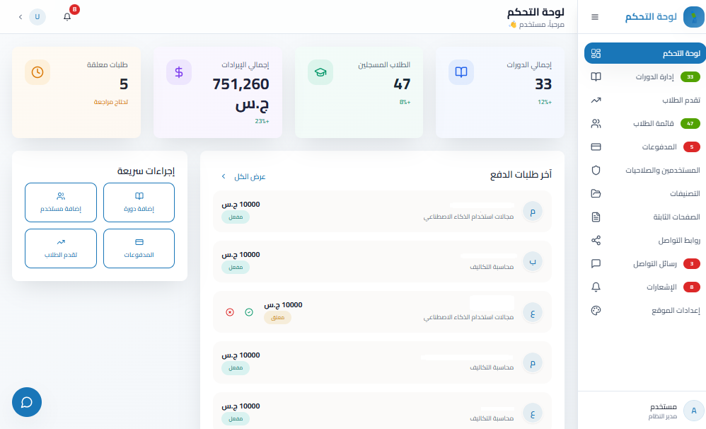 نظام اشتراكات متكامل مع تتبع تقدم الطالب ودفع أونلاين
