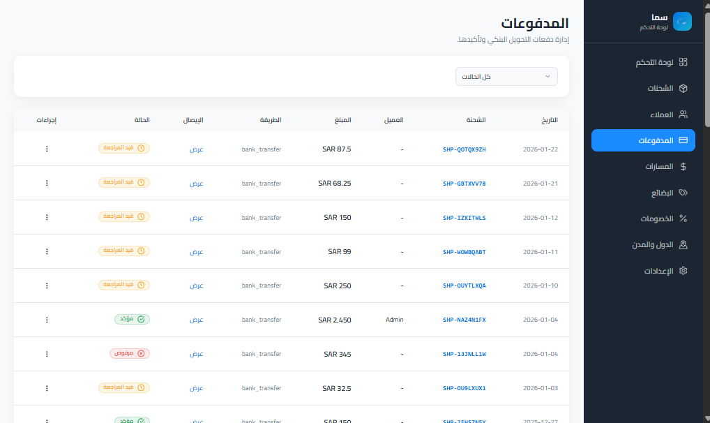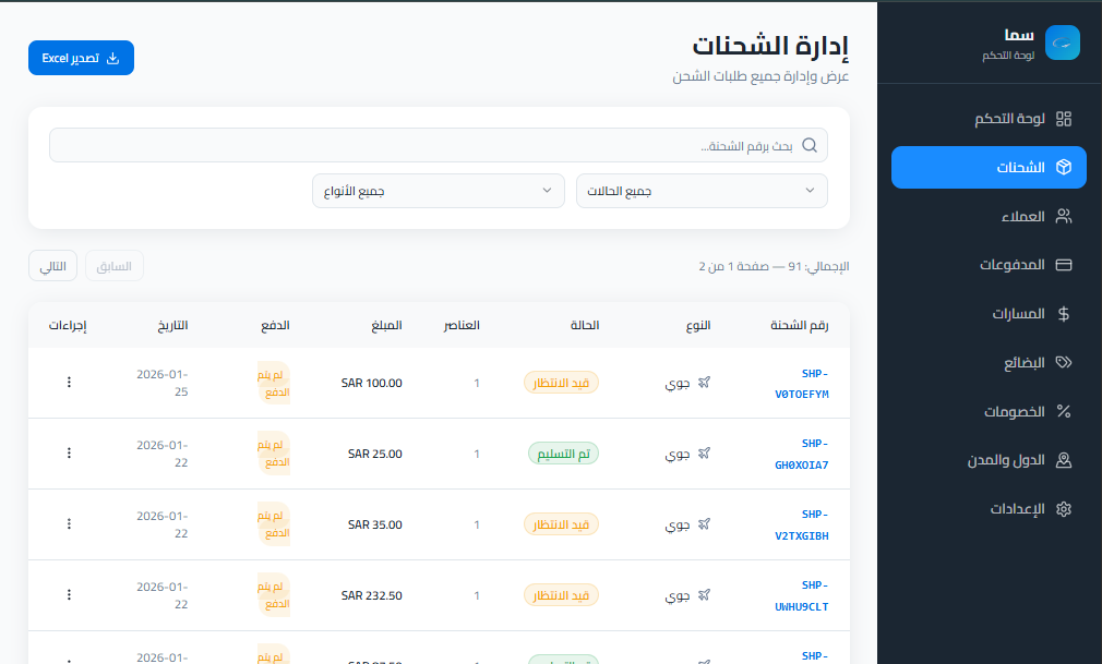 - ✓عرض عدد الشحنات وإجمالي المبالغ