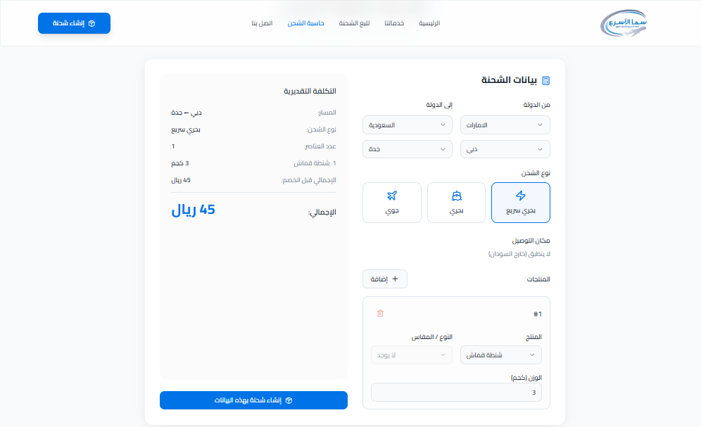 - ✓احتساب التكلفة حسب نوع الشحن والوزن